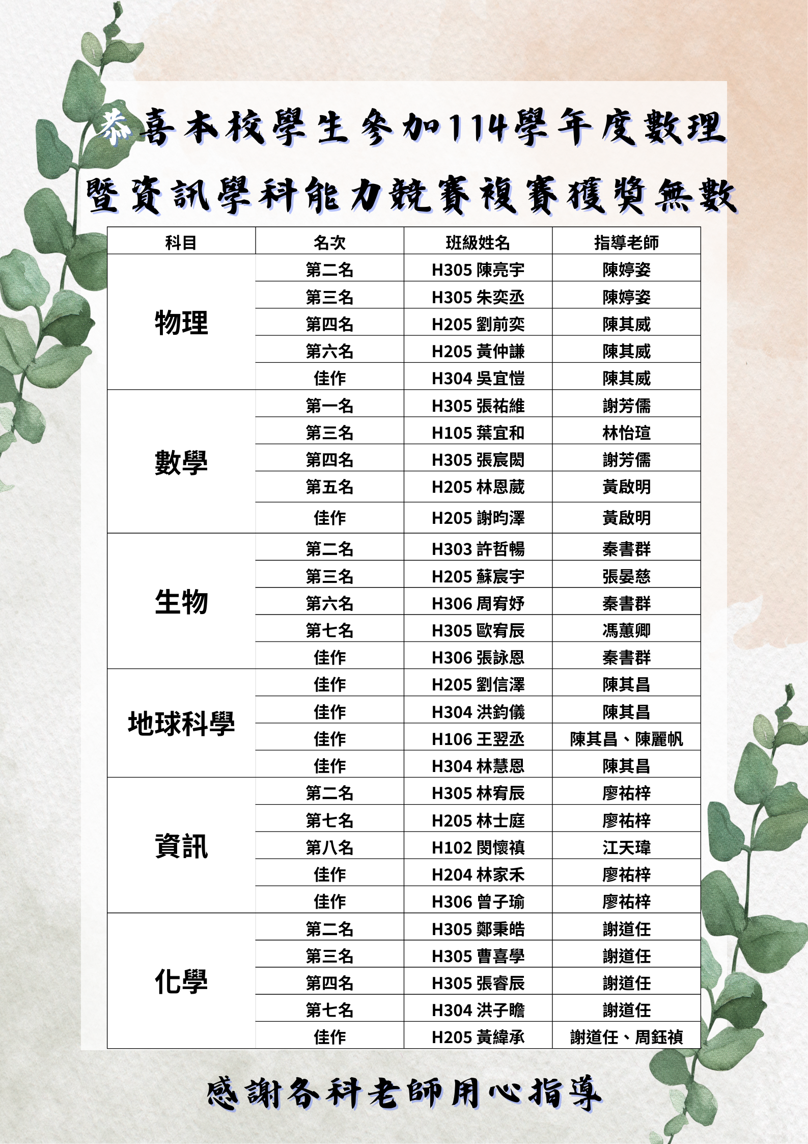 Tags: 教務處, 榮譽榜, 科學班[得獎名單]狂賀!本校學生參加114學年學科能力競賽複賽獲獎無數Post category:教務處公告訊息 / 榮譽榜 / 科學班公告訊息Post last modified:2025-12-01Post author:教務處恭喜得獎同學,也感謝老師們辛苦指導!本校學生參加114學年學科能力競賽複賽獲獎無數 Post Views: 1,133Read more articles上一篇文章[競賽資訊]第16屆全國高中職日語「看圖說故事」下一篇文章[得獎名單]本校同學於第22屆清華盃全國高中化學科能力競賽獲獎!