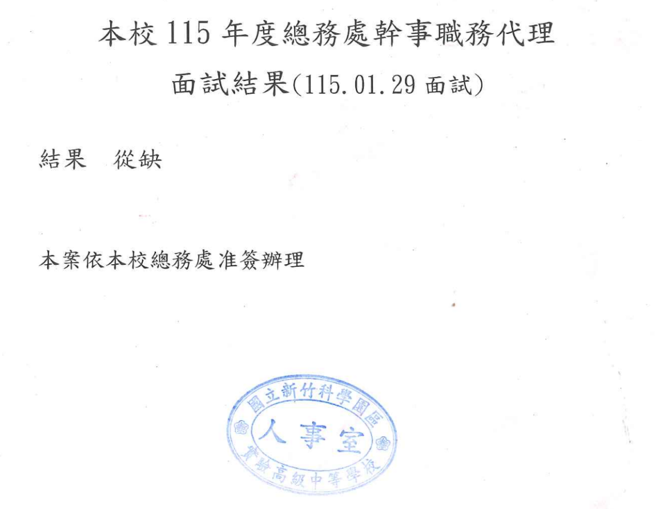 Tags: 人事室, 總務處[面試結果]本校115年度總務處幹事職務代理面試結果(115.01.29面試)Post category:人事室公告訊息 / 校務行政Post last modified:2026-02-06Post author:人事室 Post Views: 152Read more articles上一篇文章[在職進修]國立嘉義大學管理學院碩士在職專班115學年度招生資訊及招生下一篇文章[本校招生]本校115學年度幼兒園、國小、國中新生與國中小轉學生招生入學資訊(待公告核定版簡章)