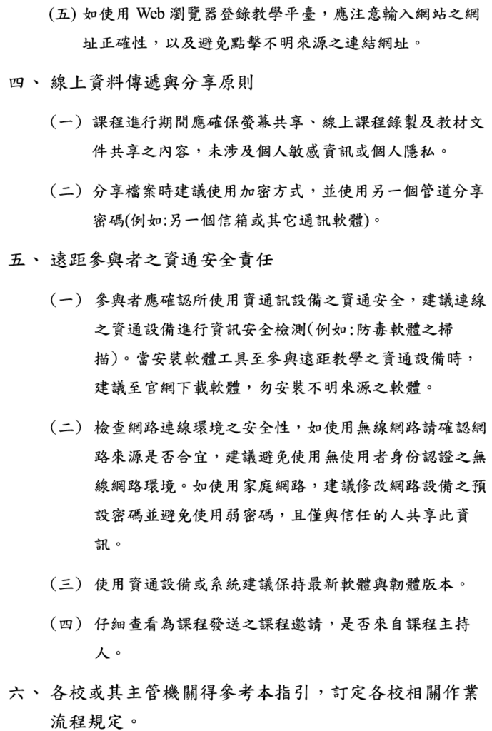 Tags: 法令規章, 資訊室[遠距資安]教育體系遠距教學之資訊安全指引Post category:校務行政 / 資訊室公告訊息 / 資訊室法令規章 / 重要發布Post last modified:2021-12-01Post author:資訊室一、依據教育部110年11月18日臺教資(四)字第1100155979號函辦理。二、為強化各級學校師生遠距教學軟體與設備之資安防護,教育部訂定「教育體系遠距教學之資訊安全指引」,以作為各校實施遠距教學時考量網路安全因素與預防措施之參考原則。教育體系遠距教學之資訊安全指引下載 Post Views: 93Read more articles上一篇文章[數位校園]本校為 Google 示範校園下一篇文章[漏洞預警]Google Chrome與Microsoft Edge瀏覽器存在多個高風險安全漏洞,允許攻擊者遠端執行任意程式碼,請儘速確認並進行更新!