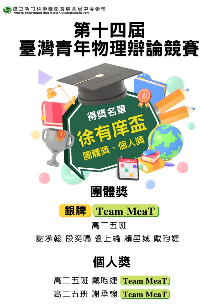Tags: 教務處[物辯銀牌]好!徐有庠盃-第十四屆臺灣青年物理辯論賽好成績!Post category:教務處公告訊息 / 榮譽榜Post last modified:2022-03-15Post author:教務處恭喜以下隊伍及同學榮獲徐有庠盃-第十四屆臺灣青年物理辯論賽好成績! Post Views: 88Read more articles上一篇文章[國際科展]狂賀!本校高中部曾亭翰同學參加2022臺灣國際科學展覽會榮獲電腦科學與資訊工程科三等獎!下一篇文章[繁星推薦]賀!本校111學年度大學繁星推薦升學管道表現亮眼!
