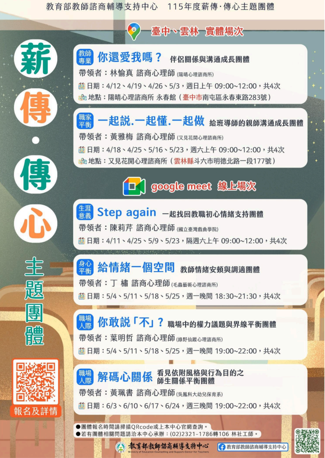 三、旨揭教師主題團體採每月1至2次,共4次;辦理期間自115年4月11日(星期六)起至115年6月24日(星期三)止。本次團體主題以「職場人際」、「職家平衡」、「教師專業」及「身心平衡」四大主題進行規劃,特別邀請國內具豐富實務經驗之團體學者專家帶領。